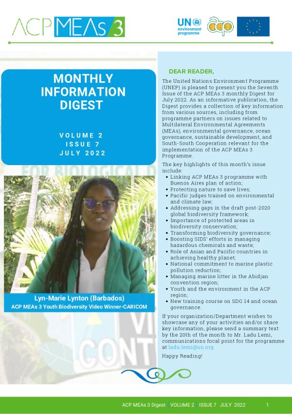 The key highlights of this month's issue include: Linking ACP MEAs 3 programme with Buenos Aires plan action; Protecting nature to save lives; Pacific judges trained on environmental and climate law; Addressing gaps in the draft post-2020 global biodiversity framework; Importance of protected areas in biodiversity conservation; Transforming biodiversity governance; Boosting SIDS efforts in managing hazardous chemicals and waste; Role of Asian and Pacific countries achieving healthy planet; National commitment to marine plastic pollution reduction; Managing marine litter in the Abidjan convention region; Youth and the environment in the ACP region; New training course on SDG 14 and ocean governance.