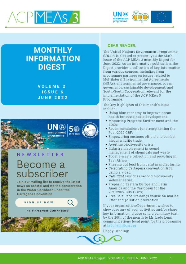 The key highlights of this month's issue include: Using blue economy to improve ocean health for sustainable development; Measuring Progress: Environment and the SDGs; Recommendations for strengthening the Post-2020 GBF; Empower customs officials to combat illegal wildlife trade; averting biodiversity crisis; Industry involvement in sound management of chemicals and waste; Boost e-waste collection and recycling in East Africa; Phasing out lead from paint manufacturing; celebrating Cartagena convention; CARICOM launches second biodiversity webinar series; Preparing Easter Europe and Latin America and the Caribbean for the 2021/2022 BRS COPs; Free Self-Pace Trainings course on marine litter pollution prevention.