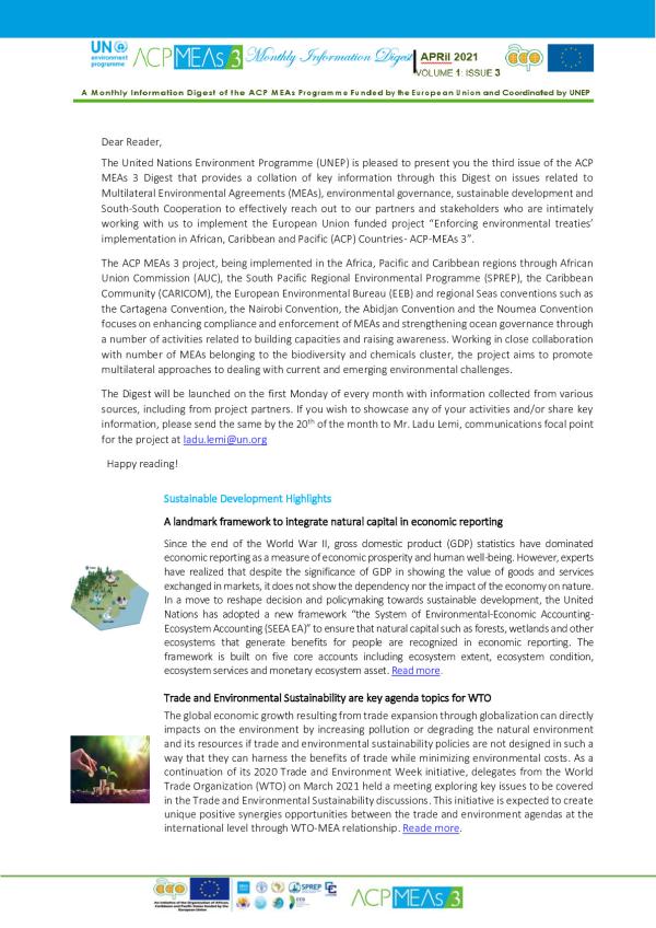 The United Nations Environment Programme (UNEP) is pleased to present you the third issue of the ACP MEAs 3 Digest that provides a collation of key information through this Digest on issues related to Multilateral Environmental Agreements (MEAs), environmental governance, sustainable development and South-South Cooperation to effectively reach out to our partners and stakeholders who are intimately working with us to implement the European Union funded project “Enforcing environmental treaties’ implementation in African, Caribbean and Pacific (ACP) Countries- ACP-MEAs 3”.