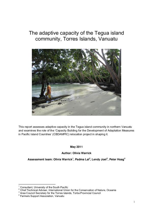 i The adaptive capacity of the Tegua island community, Torres Islands, Vanuatu This report assesses adaptive capacity in the Tegua island community in northern Vanuatu and examines the role of the âCapacity Building for the Development of Adaptation Measures in Pacific Island Countriesâ (CBDAMPIC) relocation project in shaping it. May 2011 Author: Olivia Warrick Assessment team: Olivia Warrick1, Padma Lal2, Lendy Joel3, Peter Hoag4 1 Consultant, University of the South Pacific 2 Chief Technical Adviser, International Union for the Conservation of Nature, Oceania 3 Area Council Secretary for the Torres Islands, Torba Provincial Council 4 Farmers Support Association, Vanuatu ii © Commonwealth of Australia 2012 ISBN 978-1-922003-91-1 This report was supported by funding from the Australian Government under the Pacific Australia Climate Change Science and Adaptation Planning (PACCSAP) program. The materi