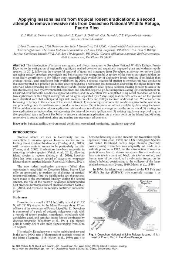 The introduction of invasive rats, goats, and rhesus macaques to Desecheo National Wildlife Refuge, Puerto Rico led to the extirpation of regionally signifi cant seabird colonies and negatively impacted plant and endemic reptile species. In 2012, following the successful removal of goats and macaques from Desecheo, an attempt to remove black rats using aerially broadcast rodenticide and bait stations was unsuccessful. A review of the operation suggested that the most likely contributors to the failure were: unusually high availability of alternative foods resulting from higher than average rainfall, and insufficient bait availability. In 2016, a second, successful attempt to remove rats was conducted that incorporated best practice guidelines developed during a workshop that focused on addressing the higher failure rate observed when removing rats from tropical islands. Project partners developed a decision-making process to assess the risks to success posed by environmental conditions and established go/no-go decision points leading up to implementation. Observed environmental conditions appeared suitable, and the operation was completed using aerial broadcast of bait in two applications with a target sowing rate of 34 kg/ha separated by 22 days. Application rates achieved on the ground were stratified such that anticipated high risk areas in the cliff s and valleys received additional bait. We consider the following to be key to the success of the second attempt: 1) monitoring environmental conditions prior to the operation, and proceeding only if conditions were conducive to success, 2) reinterpretation of bait availability data using the lower 99% confidence interval to inform application rates and ensure sufficient coverage across the entire island, 3) treating the two applications as independent, 4) increasing the interval between applications, 5) seeking regulatory approval to give the operational team sufficient flexibility to ensure a minimum application rate at every point on the island, and 6) being responsive to operational monitoring and making any necessary adjustments.