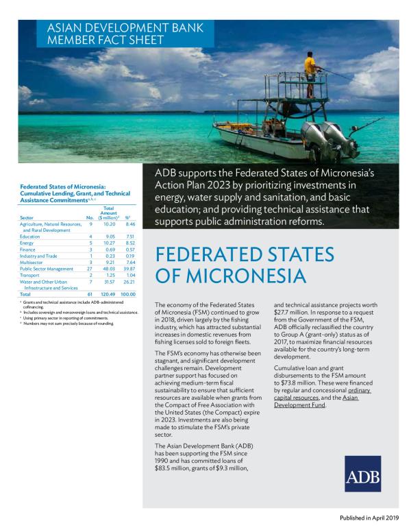 Asian Development Bank. ADB supports the Federated States of Micronesias Action Plan 2023 by prioritizing investments in energy, water supply and sanitation, and basic education; and providing technical assistance that supports public administration reforms.