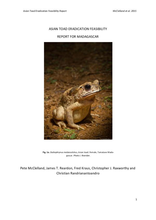 It is important to recall that Madagascar is a country of exceptional biodiversity worldwide. For example, among the 300 species of amphibians reported, the rate of endemism is nearly 100%. The recent incursion of the invasive Asian toad constitutes a direct threat to this unique biodiversity but also to human health and the country's economy. We suspect the toads impact may be comparable to the Cane toad in Australia; we must act swiftly to prevent a similar disaster unfolding in Madagascar. Record Created: 17-Oct-2016