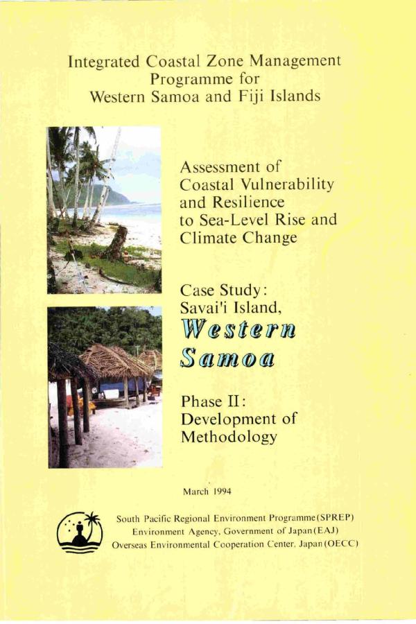 lntegrated Coastal Zone ManagementProgramme forWestern Samoa and Fij i IslandsAssessment ofCoastal Vulnerabilityand Resilienceto Sea-Level Rise andClimate ChangeCase Study:Savai'i Island,Wes6@rmSaw@alPhase II :Development ofMethodologyMarch 1994South Pacific Regional Environment Programme(SPREP)Environment Agency, Government of Japan(EAJ)Overseas Environmental Cooperation Center" Japan (OECC) ENVIRONMENT PROGRAMMETeam LeaderIbaraki University Dr. ASESEI*A D. RAVIIY]UD;. FjRWIN BALOGIIDr. NOBUO MIMLJRAMT. KAZUHITO YAMADA Pacific region islands have numerouscoastal zone or in typhoons, cyclones vulnerable to The object study is to contribute the integrated management atThe studythis object.the methodology the impacts was tested was sponsored carried out the Overseas data and Dr. Michio 2.1. Introduction.... 2.5. Nationalvulnerabilityprofile Recent land/sea-level tectonic history - . . methodological development The revised - biological............. - individual - national... Remaining methodological 5.1. Selectionofstudysites.. rise on 6.1. Introduction rise on protection facilities . . and subsistence Possible threats to vrsus subsistence the coast and the also shown.mean annual temperature data are from Apia The timescales which follows time during B. The trend is The difference curve is New 7*aland the Puapua sea-level rise wavepropagation calculationWave direction contours water wave of significant level riseweight of ratio of schools andchurches in and churches List of recent coastline thank Ausetalia Titimaea the Apiaand Talanoa are also the reprcsentatives at the the islands on the islands'coasts.by to niake main island the core core These maps will Ue ttre U..ir-ior "national vulnerability profi le.Development of a The recent the islands on Nu'utele. around the Ferry Berth site in Upolu and that along the easternmost part of Upolu'ssouth coast, which have experienced rapid subsidence during the Holocene. Other minor changes were made.to the estimating the comparative value element or its be treated another important sea-level associated sites was rather than the periphery coastline compared to many in or the core.Savai'i island is are largelymost parts rocks that the cash to cater their changing habits, and subsistence and only of study site, is on the eastern side of Savai'i. strong winds and storm recent hurricanes mentioned site shoreline surges and coastal erosion much more vulnerableto natural disasters than example, ensuring salt-tolerant, deep-rooting further inland; road exists shoreline structures around are designed are inadequate to cope existing facilities be raised The height to which facilities be raised determined on sea-level rise Towards an an accelerated rise on physical fabric of fallacious, although disruptive inoceans. There danger that the superficial long-term future result in considerably Despite the Samoa is made largely of high importance compared to their any except islands and industrial, manufact