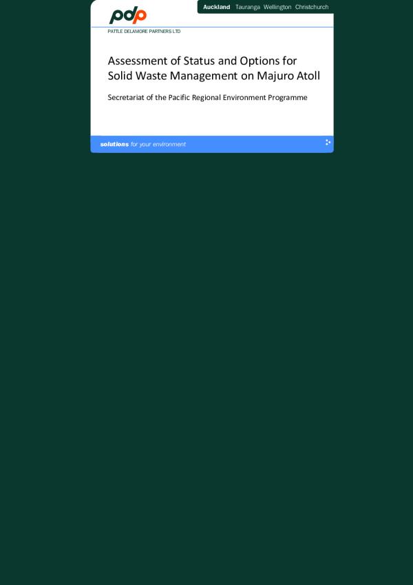 Pattle Delamore Partners Ltd (PDP) has been engaged by the Secretariat of the Pacific Regional Environment Programme (SPREP) to undertake an assessment of the status and options for solid waste management (SWM) on Majuro Atoll. This work is being done under the Atoll Waste Management Component of the Pacific Hazardous Waste Management Programme (PacWaste) which aims to demonstrate the establishment of an integrated sustainable SWM system in the Republic of the Marshall Islands (RMI) which improves and expands on existing 4R practices (Refuse, Reduce, Reuse, Recycle), improves existing waste collection and disposal practices, and which is founded on user-pays and polluter-pays principles. The field work for this consultancy was completed in June-July 2014.