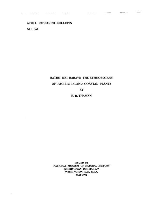 Jonathan Sauer (1961) remarked, in his Coastal Plant Geography of Mauritius, that the chance to study the coastal vegetation there was like being "admitted to a field worker's paradise" and stressed that "most tropical coasts are beautiful and exciting, particularly to people concerned with natural processes . . .." The same can certainly be said for the tropical coasts of the often Edenized islands of the Pacific Ocean. Their "beauty and excitement" is considerably enhanced, however, when one is also "concerned" with cultural processes and ethnobotany, in particular, the immense cultural utility of coastal plants, a factor which strongly influences the distribution and character of plant communities.
