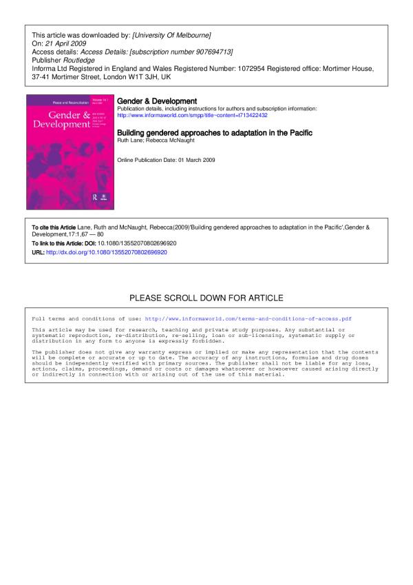 This article reflects upon how gendered approaches to climate-change adaptation can be strengthened in the Pacific region. The article looks at what has been learnt in the region, surveys some examples of best practice in gender-responsive programming, identifies the challenges we face on our journey, and suggests future directions. It is a collaborative effort, comprising input from a number of agencies who have been proactive in the areas of gender, climate change, and disaster risk-reduction in the Pacific Region, including: the Red Cross/Red Crescent Movement in the Pacific region; the UNDP Pacific Centre; and World Wildlife Funds (WWF) Fiji Country Programme.