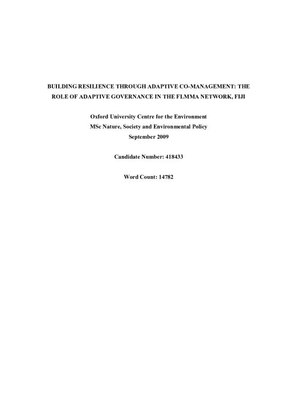 Adaptive co-management is an emerging approach to natural resource management, which aims to create cross scale, collaborative schemes, that foster resilience in socioecological systems. However the social mechanisms and processes, which create and sustain adaptive co-management are under investigated and misunderstood. The objective of this study is to determine the social sources of resilience in a scheme of comanagement in Fiji, called the Fiji Locally Managed Marine Areas Network (FLMMAN). Using the theoretical framework of adaptive governance to examine networks and linkages, this study aims to determine the adaptive social mechanisms and processes in the FLMMAN network which enable resilient outcomes. The study finds that strong leadership, the presence of shadow epistemic communities and the role of FLMMAN as a bridging organisation, have been crucial. However the adaptive capacity has been inhibited by cultural and political barriers.