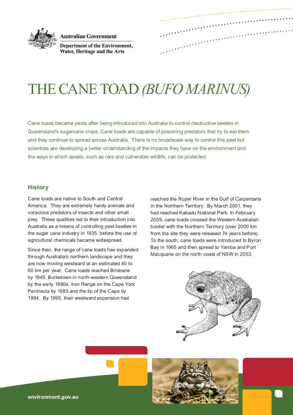 4 page Fact sheet provides general information to background history, disribution, behavior, description of Cane Toad in different life stages, why they are invasive pest, and control actvities; The Australian Government cane toad commitment is providing more than $2 million over two years (2008-09 to 2009-10) to reduce the impacts of cane toads and to develop a national cane toad plan. Through these investments under the Caring for our County initiative, the Government is continuing to assist with funding for ground-control work, as well as research and development of sustainable control measures. In 2009-10, the Government provided over $1 million for community-based control activities and research to reduce cane toad numbers.