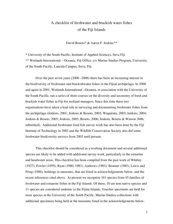 208A checklist of freshwater and brackish water fishes of the Fiji Islands David Boseto* & Aaron P. Jenkins** * University of the South Pacific, Institute of Applied Sciences, Suva Fiji ** Wetlands International â Oceania, Fiji Office, c/o Marine Studies Program, University of the South Pacific, Laucala Campus, Suva, Fiji Over the past seven years (2000 â2006) there has been an increasing interest in the biodiversity of freshwater and brackishwater fishes in the Fijian archipelago. In 2000 and again in 2001, Wetlands International âOceania, in association with the University of the South Pacific, ran a series of short courses on the diversity and taxonomy of fresh and brackish water fishes in Fiji for wetland managers. Since this time these two organizations have taken a lead role in surveying and documenting freshwater fishes from the archipelago (Jenkins, 2001; Jenkins & Boseto, 2003; Waqairatu, 2003; Jenkins, 2004; Jenkins & Boseto, 2005; Jenkins, 2005; Boseto, 2006; Jenkins, Bos