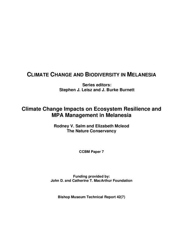 Climate change poses a major threat to marine ecosystems, species, and productivity from the tropics to the poles. The marine ecosystems of Melanesia are no exception, but many may be well positioned to survive expected climate impacts, including coral bleaching, sea-level rise, ocean acidification, and increased severity of tropical storms.