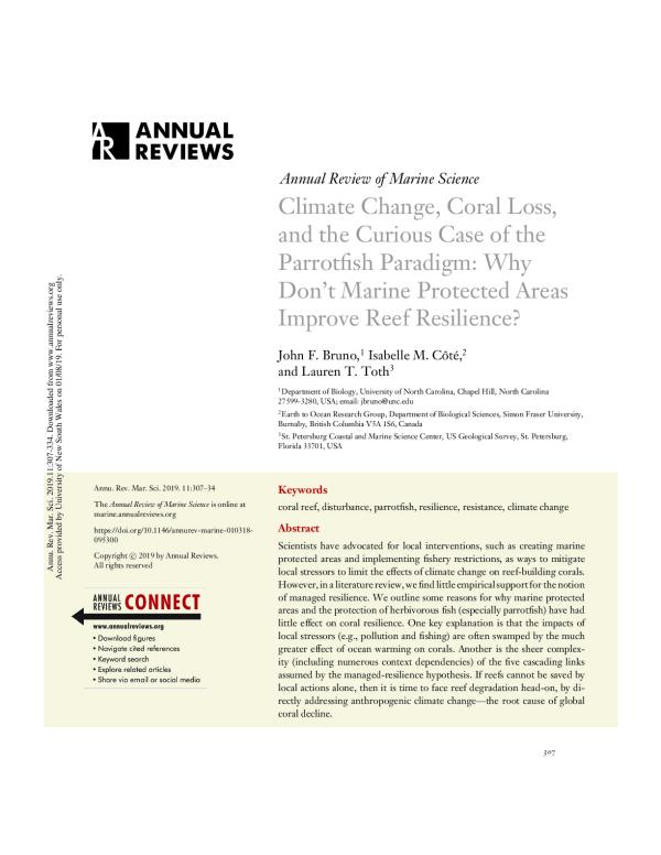 Scientists have advocated for local interventions, such as creating marine protected areas and implementing fishery restrictions, as ways to mitigate local stressors to limit the effects of climate change on reef-building corals Record Created: 05-Jun-2019