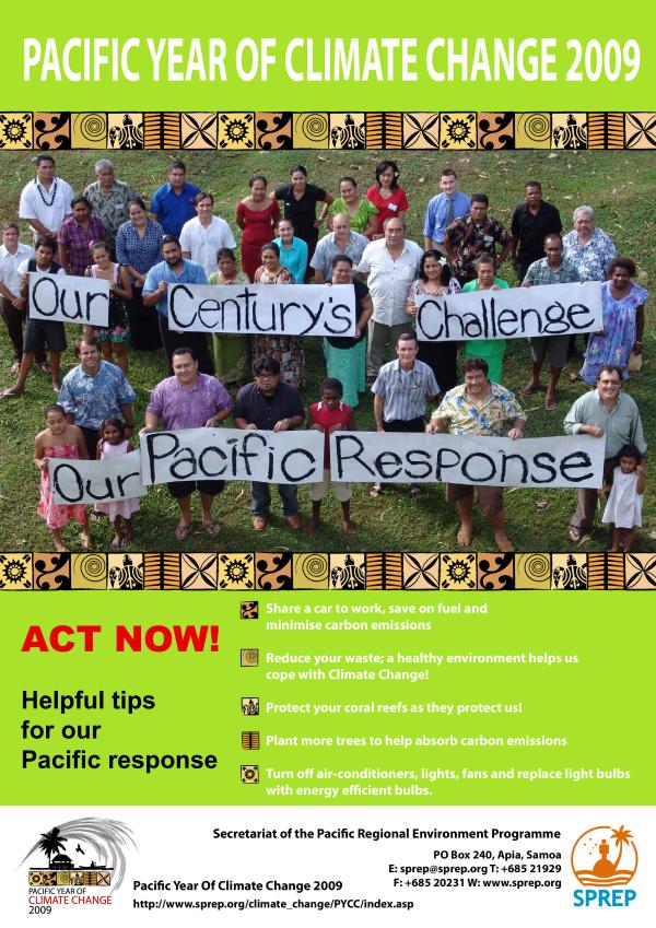 PYCC poster_lgPACIFIC YEAR OF CLIMATE CHANGE 2009 ACT NOW! Helpful tips for our Pacific response Share a car to work, save on fuel and minimise carbon emissions Reduce your waste; a healthy environment helps us cope with Climate Change! Protect your coral reefs as they protect us! Plant more trees to help absorb carbon emissions Turn o� air-conditioners, lights, fans and replace light bulbs with energy e�cient bulbs. PO Box 240, Apia, Samoa E: sprep@sprep.org T: +685 21929 F: +685 20231 W: www.sprep.org Secretariat of the Paci�c Regional Environment Programme Paci�c Year Of Climate Change 2009 http://www.sprep.org/climate_change/PYCC/index.asp