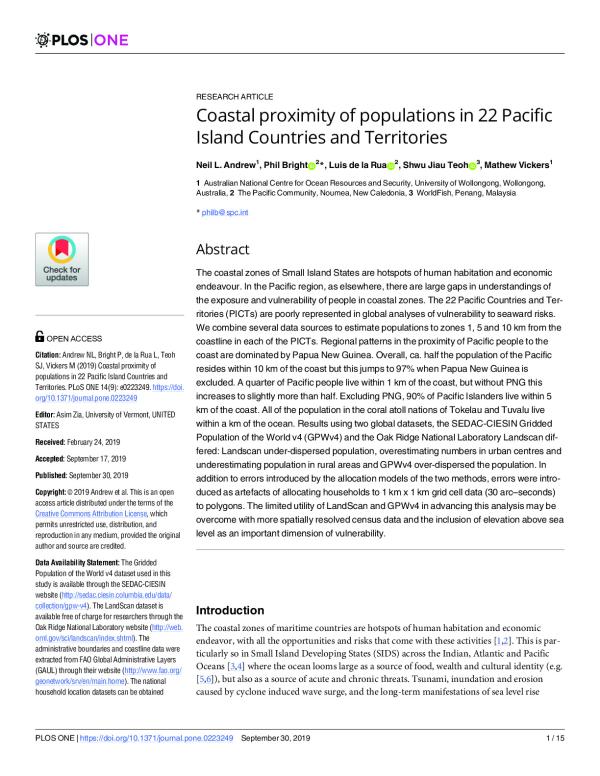 The coastal zones of Small Island States are hotspots of human habitation and economic endeavour. In the Pacific region, as elsewhere, there are large gaps in understandings of the exposure and vulnerability of people in coastal zones. The 22 Pacific Countries and Territories (PICTs) are poorly represented in global analayses of vunerability to seaward risks. We combine several data sources to estimates populations to zones 1, 5 and 10 km from the coastline in each of the PICTs. Regional patterns in the proximity of Pacific people to the coast are dominated by Papua New Guinea. Overall, ca. half the population of the Pacific resides within 10 km of the coast but this jumps to 97% when Papua New Guinea is excluded. A quarter of Pacific people live within 1 km of the coast, but without PNG this increases to slightly more than half. Excluding PNG, 90% of Pacific Islanders live within 5 km of the coast. All of the population in the coral atoll nations of Tokelau and Tuvalu live within a km of the ocean. Results using two global datasets, the SEDAC-CIESIN Gridded Population of the World v4 (GPWv4) and the Oak Ridge National Laboratory Landscan differed: Landscan under-dispersed population, overestimating numbers in urban centres and underestimating population in rural areas and GPWv4 ove-dispersed the population. In addition to errors introduced by the allocation models of the two methods, errors were introduced as artefacts of allocating households to 1km x 1km grid cell data (30 arc-seconds) to polygons. The limited utility of LandScan and GPWv4 in advancing this analysis may be overcome with more spatially resolved census data and the inclusion of elevation above sea level as an important dimensioni of vulnerability.