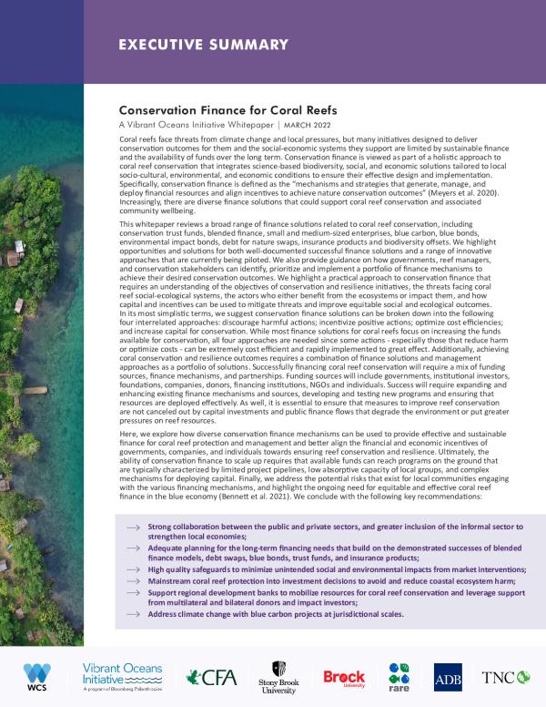 Coral reefs face threats from climate change and local pressures, but many initiatives designed to deliver conservation outcomes for them and the social-economic system they support are limited by sustainable finance and the availability of funds over the long term.