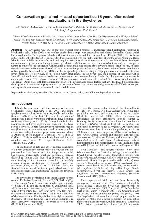The Seychelles was one of the ?rst tropical island nations to implement island restoration resulting in biodiversity gain. In the 2000s a series of rat eradication attempts was undertaken in the inner Seychelles islands which had mixed results. Three private islands with tourist resorts successfully eradicated rats: Frégate (2000), Denis Island (2003) and North Island (2005). Frégate Island was successful with the ?rst eradication attempt whereas North and Denis Islands were initially unsuccessful, and both required second eradication operations. All three islands have developed conservation programmes including biosecurity, habitat rehabilitation, and species reintroductions, and have integrated nature into the tourism experience. Conservation actions, including rat and other invasive species eradications, on these three islands resulted in the creation of 560 ha of mammalian predator-free land, the reintroduction of seven populations of ?ve globally threatened birds (GTB) and the safeguarding of two existing GTB populations and several reptile and invertebrate species. However, on these and many other islands in the Seychelles, the potential of this conservation model, where island owners implement conservation programmes largely funded by the tourism businesses in collaboration with NGOs (Non-Government Organisations), has not been fully realised. We review the rehabilitation on Frégate, Denis and North Islands from inception to the present, and assess factors that have facilitated the subsequent development of conservation programmes, the presence of receptive businesses and governmental/NGO/donor support and explore limitations on business-led island rehabilitation.