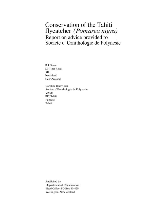 The Tahiti flycatcher (Pomarea nigra) is one of several monarch flycatcher species in the Polynesian genus Pomarea, all of which are threatened. The Tahiti flycatcher is currently known from only the western side of Tahiti where, during the 1998-99 season, at least 24 individuals, including 10 pairs, were located in four valleys (Blanvillain 1999). Although ten nests were protected from rats in 1998-99, only three were successful in fledging young. Two of these young apparently disappeared one week after fledging and the third, two months after fledging (Blanvillain 1999). Concern was raised about the possible predation by common myna (Acridotheres tristis), and/or red-vented bulbul (Pycnonotus cafer) on juveniles. In 1999-2000 the Societe d'Ornithologie de Polynesie (MANU) was granted funding for Tahiti flycatcher conservation by the South Pacific Regional Environment Programme (SPREP). During 13-26 September 1999, RP visited Tahiti to advise and help CB with aspects of the programme. This advisory work was funded by the N.Z. Ornithological Congress Trust Board (ICBP). It builds on work by Gaze & Blanvillain (1998) funded by the Pacific Development and Conservation Trust.
