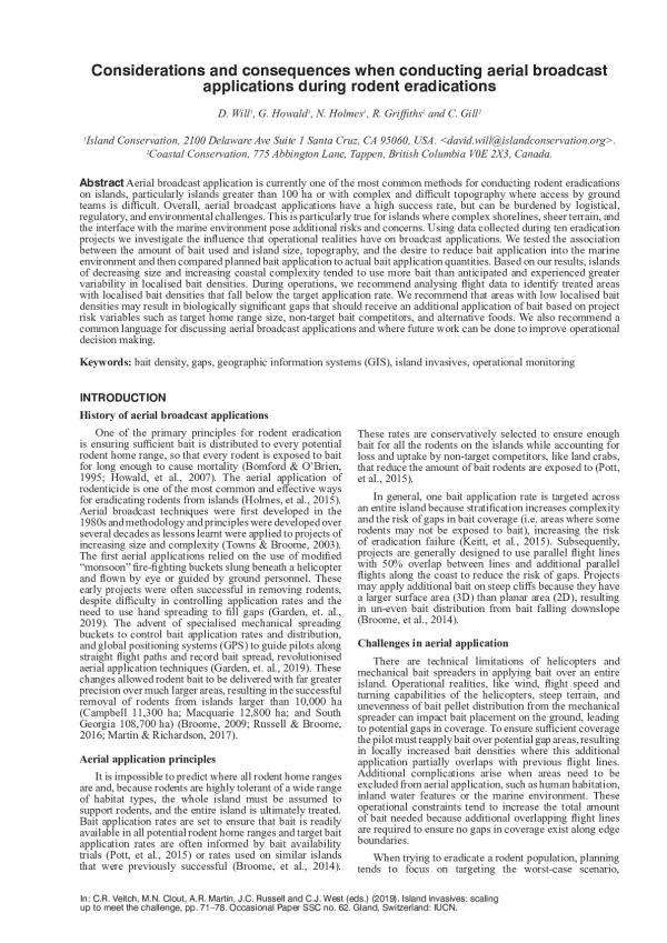 Aerial broadcast application is currently one of the most common methods for conducting rodent eradications on islands, particularly islands greater than 100 ha or with complex and difficult topography where access by ground teams is difficult. Overall, aerial broadcast applications have a high success rate, but can be burdened by logistical, regulatory, and environmental challenges. This is particularly true for islands where complex shorelines, sheer terrain, and the interface with the marine environment pose additional risks and concerns. Using data collected during ten eradication projects we investigate the influence that operational realities have on broadcast applications. We tested the association between the amount of bait used and island size, topography, and the desire to reduce bait application into the marine environment and then compared planned bait application to actual bait application quantities. Based on our results, islands of decreasing size and increasing coastal complexity tended to use more bait than anticipated and experienced greater variability in localised bait densities. During operations, we recommend analysing flight data to identify treated areas with localised bait densities that fall below the target application rate. We recommend that areas with low localised bait densities may result in biologically significant gaps that should receive an additional application of bait based on project risk variables such as target home range size, non-target bait competitors, and alternative foods. We also recommend a common language for discussing aerial broadcast applications and where future work can be done to improve operational decision making.