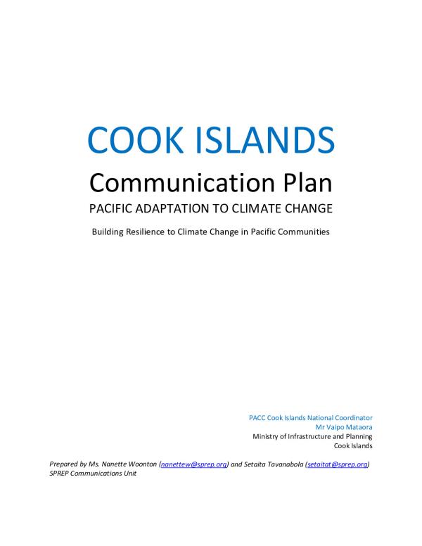 COOK ISLANDS Communication Plan PACIFIC ADAPTATION TO CLIMATE CHANGE Building Resilience to Climate Change in Pacific Communities PACC Cook Islands National Coordinator Mr Vaipo Mataora Ministry of Infrastructure and Planning Cook Islands Prepared by Ms. Nanette Woonton (nanettew@sprep.org) and Setaita Tavanabola (setaitat@sprep.org) SPREP Communications Unit mailto:nanettew@sprep.org�mailto:setaitat@sprep.org� The Pacific Adaptation to Climate Change Project is implemented by the United Nations Development Programme in partnership with the Secretariat of the Regional Environment Programme, and funded by the Global Environment Facility and the Australian Agency for International Development. It is nationally executed by the Ministry of Infrastructure and Planning. Table Contents BACKGROUND of PACC ......................................................................