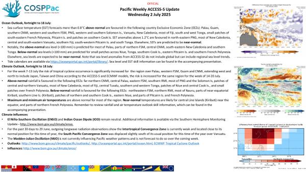 Ocean Outlook, fortnight to 18 July: • Sea surface temperature (SST) forecasts more than 0.8°C above-normal are favoured in the following country Exclusive Economic Zone (EEZs): Palau, Guam, southern CNMI, western and southern FSM, PNG, western and southern Solomon Is., Vanuatu, New Caledonia, most of Fiji, south and west Tonga, small patches of south-eastern French Polynesia, Pitcairn Is. and patches on southern Cook Is. SST anomalies above 1.2°C are favoured in north-eastern PNG, most of New Caledonia, central and south-eastern Vanuatu, southern Fiji, south-western Pitcairn Is. and south Tonga. Elsewhere, SSTs are predicted to be near-normal.