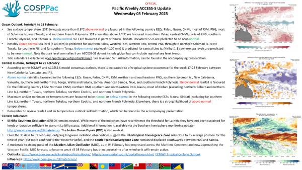 Ocean Outlook, fortnight to 21 February: • Sea surface temperature (SST) forecasts more than 0.8°Cabove normal are favoured in the following country EEZs: Palau, Guam, CNMI, most of FSM, PNG, most of Solomon Is., west Tuvalu, and southern French Polynesia. SST anomalies above 1.2°C are favoured in southern Palau, central CNMI, parts of PNG, southern French Polynesia, and Pitcairn Is.. Below normal SSTs are favoured in parts of Nauru, Kiribati. Elsewhere SSTs are predicted to be near-normal.