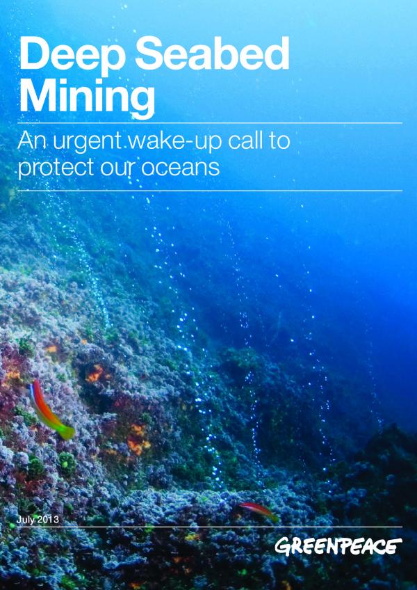 July 2013 An urgent wake-up call to protect our oceans Deep Seabed MiningTitle of report For more information contact: pressdesk.int@greenpeace.org Written by: Alicia Craw Contributors: David Santillo, Richard Page, Eleanor Partridge, Milko Schvartman, Sofia Tsenikli Edited by: Steve Erwood, Isabel Leal Cover image © Greenpeace / Gavin Newman Hydrothermal vents at Dom João De Castro. JN 452 Published July 2013 by Greenpeace International Ottho Heldringstraat 5, 1066 AZ Amsterdam, The Netherlands Tel: +31 20 7182000 greenpeace.org DEEP SEABED MINING AN URGENT WAKE-UP CALL TO PROTECT OUR OCEANS Deep seabed mining 3 Potential impacts 6 The urgent need for high seas protection 14 Greenpeace's position 16 Calling for a high seas biodiversity agreement 17 Endnotes 18DEEP SEABED MINING AN URGENT WAKE-UP CALL TO PROTECT OUR OCEANS 3 An urgent wake-up call to protect our oceans The deep sea is a place of myth and mystery, filled with weird and wonderful life forms, and vital to the survival of our pla
