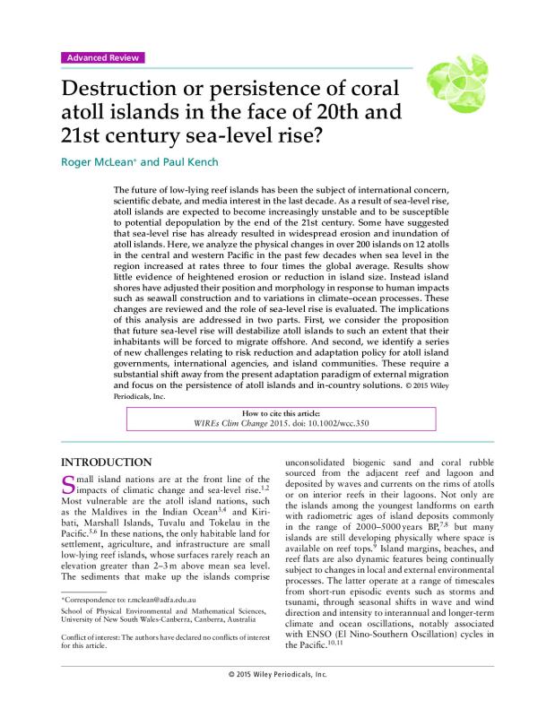 The future of lw-lying reef islands has been in the subject of international concern, scientific debate, and media interest in the last decade. As a result of sea-level rise, atoll islands are expected to become increasingly unstable and to be susceptible to potential depopulation by the end of the 21st century.