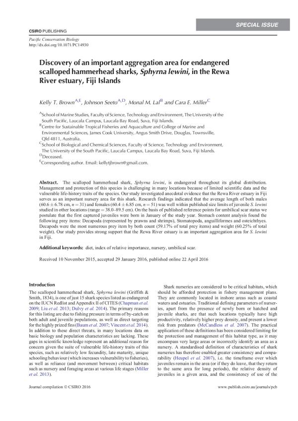 The scalloped hammerhead shark, Sphyrna lewini, is endangered throughout its global distribution. Management and protection of this species is challenging in many locations because of limited scientific data and the vulnerable life-history traits of the species. Our study investigated anecdotal evidence that the Rewa River estuary in Fiji serves as an important nursery area for this shark. Research findings indicated that the average length of both males (60.6 ± 6.78 cm, n = 31) and females (60.4 ± 6.85 cm, n = 51) was well within published size limits of juvenile S. lewini studied in other locations (range = 38.089.5 cm). On the basis of published reference points for umbilical scar status we postulate that the first captured juveniles were born in January of the study year. Stomach content analysis found the following prey items: Decapoda (represented by prawns and shrimps), Stomatopoda, anguilliformes and osteichthyes. Decapods were the most numerous prey item by both count (59.17% of total prey items) and weight (60.25% of total weight). Our study provides strong support that the Rewa River estuary is an important aggregation area for S. lewini in Fiji.
