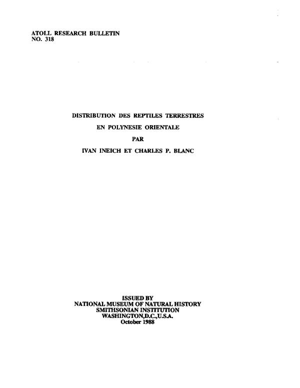 A faunistic account of the terrestrial reptiles occurring on islands and atolls of Eastern Polynesia is provided along with a description of their biogeographic characteristics. The distribution area of each species is presented in relation to frequencies of occurrence, maximum area of coverage, biology and limits of the present state of knowledge.