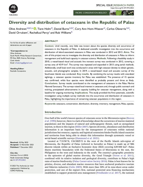 Until recently,very little was known about the species diversity and occurrence of cetaceans in the Republic of Palau. A dedicated scientific investigation into the occurrence and distribution of island associated cetaceans in Palau was conducted in 2012 and 2012.