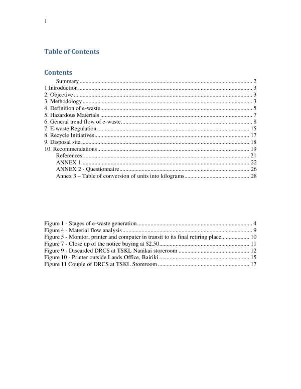 The use and introduction of Electrical and Electronic Equipment has rapidly increased in Kiribati over the years, resulting in growing amounts of electrical and electronic waste (or e-waste for short) that are discarded and carelessly thrown away in our own backyard once they have reached their useful life. E-waste is categorized as hazardous waste, as it also contains hazardous substances like lead, cadmium and mercury. Incorrect disposal of e-waste, could cause serious damage to our environment and to our own health. To this end this base line study is launched to determine the problem on the amount of e-waste that has been generated with some self-induced due to lack of quality control at point of entry..