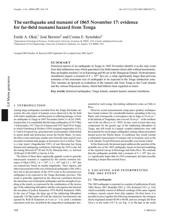 Historical reports of an earthquake in Tonga in 1865 November identify it as the only event from that subduction zone which generated a far-field tsunami observable without instruments. Run-up heights reached 2 m in Rarotonga and 80 cm in the Marquesas Islands. Hydrodynamic simulations require a moment of 4 x 1028 dyn cm, a value significantly larger than previous estimates of the maximum size of earthquake to be expected at the Tonga subduction zone. This warrants an upwards re evaluation of the tsunami risk from Tonga to the Cook Islands and the various Polynesian chains, which had hitherto been regarded as minor.