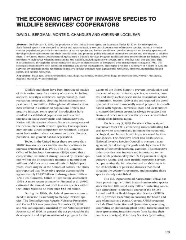 On February 3, 1999, the president of the United States signed an Executive Order 13112 on invasive species. Each federal agency was directed to detect and respond rapidly to control populations of invasive species, monitor invasive species populations, provide for restoration of native species and habitat conditions, conduct research on invasive species and develop technologies to prevent their introduction, and promote public education on invasive species and the means to address them. The United States Department of Agricultures Wildlife Services Program fulfills a federal responsibility for helping solve problems which occur when human activity and wildlife, including invasive species, are in conflict with one another. This is accomplished through the recommendation and/or implementation of integrated pest management strategies (IPM). IPM strategies often involve both technical assistance and direct management. This paper provides a summary of 8 years of Wildlife Services involvement in the resolution of invasive species conflicts with agricultural resources, property, human health and safety, and natural resources. Record Created: 10-Jun-2016