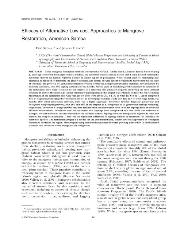 Three mangrove restoration methods were tested at Nu'uuli, Tutuila island, American Samoa. Since cleaning 27 years ago converted the mangrove into a mudflat, the ecosystem showed no natural regrowth despite an ample supply of propagules.