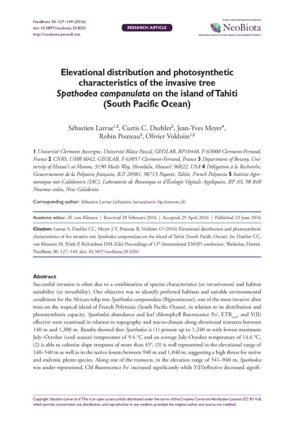 Successful invasion is often due to a combination of species characteristics (or invasiveness) and habitat suitability (or invasibility). Our objective was to identify preferred habitats and suitable environmental conditions for the African tulip tree Spathodea campanulata (Bignoniaceae), one of the most invasive alien trees on the tropical island of French Polynesia (South Pacific Ocean), in relation to its distribution and photosynthesis capacity. Spathodea abundance and leaf chlorophyll fluorescence