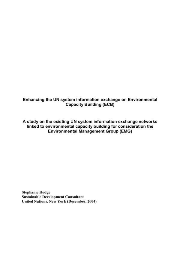 This paper aims to provide an overview of the existing policy framework, activities and coordinating arrangements in the area of UN inter-agency information exchange concerning environmental capacity building. It has been prepared for the Environmental Management Group (EMG) by an independent consultant who is familiar with UN information exchange networks concerning environmental capacity building that are operating within the United Nations. The paper aims to identify opportunities for enhancing UN system information exchange and coordination in the area of environmental capacity building and to explore possible areas in which the EMG might provide added value.
