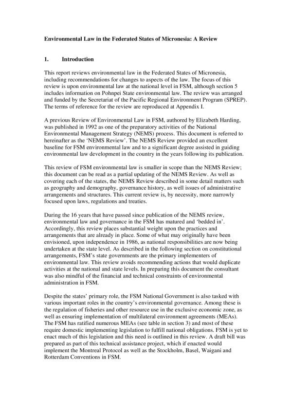 This report reviews environmental law in the Federated States of Micronesia, including recommendations for changes to aspects of the law. The focus of this review is upon environmental law at the national level in FSM. although section 5 includes information on Pohnpei State environmental law. The review was arranged and funded by the Secretariat of the Pacific Regional Environment Program (SPREP).