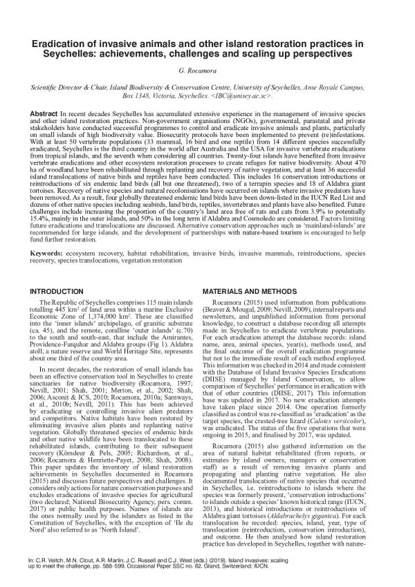 In recent decades Seychelles has accumulated extensive experience in the management of invasive species and other island restoration practices. Non-government organisations (NGOs), governmental, parastatal and private stakeholders have conducted successful programmes to control and eradicate invasive animals and plants, particularly on small islands of high biodiversity value. Biosecurity protocols have been implemented to prevent (re)infestations. With at least 50 vertebrate populations (33 mammal, 16 bird and one reptile) from 14 different species successfully eradicated, Seychelles is the third country in the world after Australia and the USA for invasive vertebrate eradications from tropical islands, and the seventh when considering all countries. Twenty-four islands have bene?ted from invasive vertebrate eradications and other ecosystem restoration processes to create refuges for native biodiversity. About 470 ha of woodland have been rehabilitated through replanting and recovery of native vegetation, and at least 36 successful island translocations of native birds and reptiles have been conducted. This includes 16 conservation introductions or reintroductions of six endemic land birds (all but one threatened), two of a terrapin species and 18 of Aldabra giant tortoises. Recovery of native species and natural recolonisations have occurred on islands where invasive predators have been removed. As a result, four globally threatened endemic land birds have been down-listed in the IUCN Red List and dozens of other native species including seabirds, land birds, reptiles, invertebrates and plants have also bene?ted. Future challenges include increasing the proportion of the countrys land area free of rats and cats from 3.9% to potentially 15.4%, mainly in the outer islands, and 50% in the long term if Aldabra and Cosmoledo are considered. Factors limiting future eradications and translocations are discussed. Alternative conservation approaches such as mainland-islands are recommended for large islands, and the development of partnerships with nature-based tourism is encouraged to help fund further restoration.