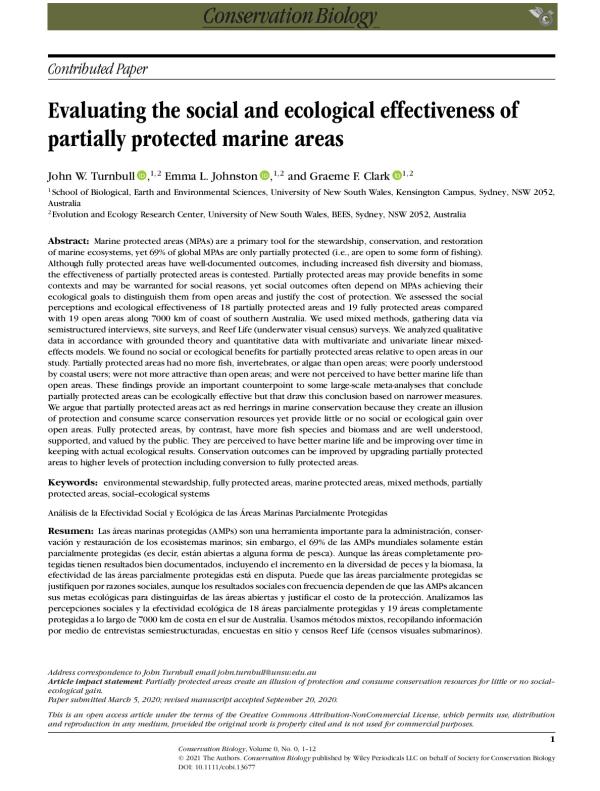 Marine protected areas (MPAs) are a primary tool for the stewardship, conservation, and restoration of marine ecosystems, yet 69% of global MPAs are only partially protected (i.e., are open to some form of fishing). Although fully protected areas have well-documented outcomes, including increased fish diversity and biomass, the effectiveness of partially protected areas is contested. Partially protected areas may provide benefits in some contexts and may be warranted for social reasons, yet social outcomes often depend on MPAs achieving their ecological goals to distinguish them from open areas and justify the cost of protection. We assessed the social perceptions and ecological effectiveness of 18 partially protected areas and 19 fully protected areas compared with 19 open areas along 7000 km of coast of southern Australia.