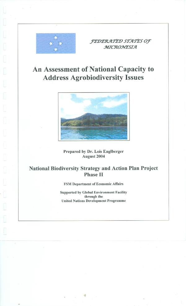 The conservation and sustainable use of agrobiodiversity (AB) in the Federated States of Micronesia (FSM) is considered as essential for the nation's development and ensuring future food security. The National Biodiversity Strategy and Action Plan (NBSAP) Phase II project to assess the capacity of the FSM to address AB issues was carried out between January and August 2004, as led by the FSM Department of Economic Affairs. The assessment reviewed systemic, institutional, and individual levels relating to AB issues and documented the programs and activities involved in addressing AB issues, groups implementing programs and activities, inter-group linkages, and the obstacles and possible solutions to addressing AB issues in FSM. A questionnaire for collecting the relevant information from all four FSM states was developed for collecting information, and data were also collected through workshops and key informant interviews