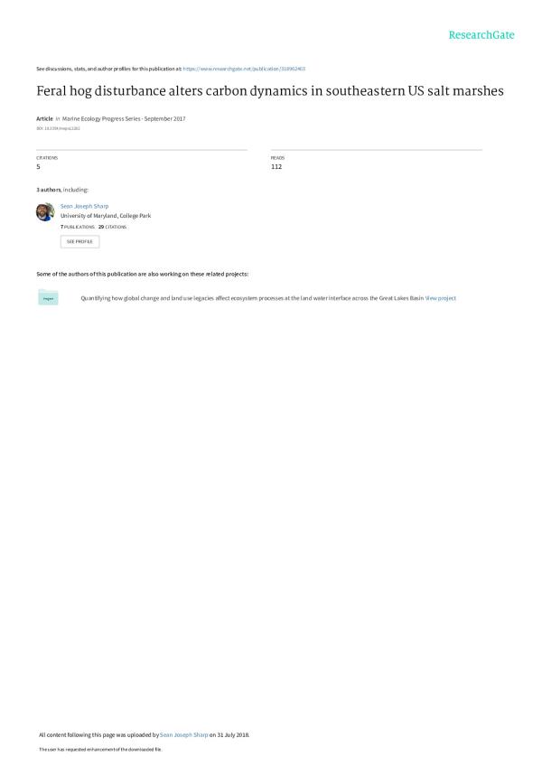Disturbances that remove primary producers and alter substrate chemistry commonly influence ecosystem carbon dynamics. Because coastal wetlands are especially effective in sequestering carbon, quantifying how disturbances may alter their ability to perform this climate-regulating function is important for assessing their carbon storage potential. Here, we quantified soil respiration, litter decomposition, and soil organic carbon (SOC), as a proxy for carbon storage, in areas disturbed by invasive feral hogs Sus scrofa and in adjacent, undisturbed areas within 3 southeastern US salt marshes. Contrary to our hypothesis that hog overturning of soils would stimulate soil respiration, this metric was lower and both surface and subsurface litter decomposition rates were similar in disturbed relative to undisturbed areas across all sites. SOC was lower in disturbed versus undisturbed areas at 2 sites as hypothesized, but higher at 1 site. Surveys and analyses reveal that lower and less variable infauna, plant, and benthic algae densities likely suppressed soil respiration in hog-disturbed versus undisturbed areas, while the offsetting effects of lower invertebrate densities and higher soil temperature likely caused decomposition to be consistent within and outside of disturbed areas. . These findings suggest that hog removal of plants and disruption of soils can cause tracts of marsh to transition from carbon sinks to sources where these disturbances are intense enough to prohibit rapid plant recovery and promote the gradual respiration of carbon stocks from denuded soils.