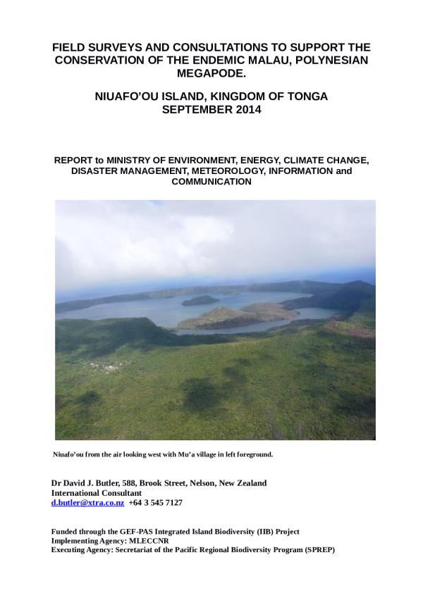 The objective of the project was improved conservation status of priority threatened species, consistent with selected outcomes set out in the Island Biodiversity Programme of Work (IBPOW). Surveys were initially aimed at establishing the status of species on three different islands Niuafoou, Late and Fonualei to assess fate of introduced populations of Polynesian Megapode. Surveys of Late and Fonualei were conducted in September 2013 but the cancellation of flights to Niuafoou that year resulted in surveys there being delayed until the current survey a year later.