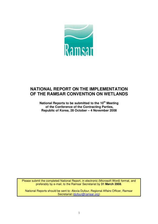 This Ramsar COP10 National Report Format (NRF) has been approved by the Standing Committee for the Ramsar Conventions Contracting Parties to complete as their national reporting to the 10th meeting of the Conference of the Contracting Parties of the Convention (Republic of Korea, October/November 2008).