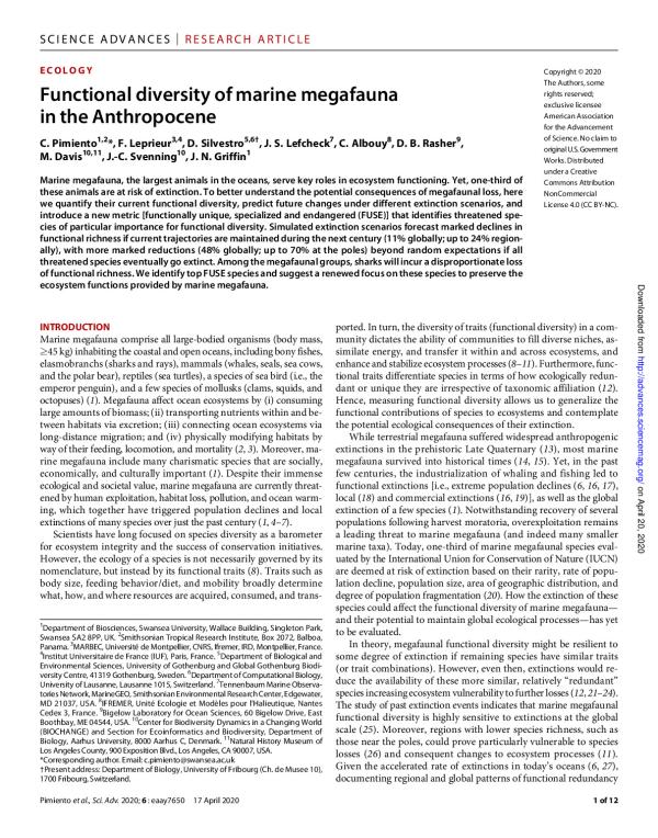 Marine megafauna, the largest animals in the ocea, serve key roles in ecosystem functioning. Yet, one-third of these animals are at risk if extinction. To better understand the potential consequences of megafauna loss, here we quantify their current functional diersity, predict future changes under different extinction scenarios, and intoduce a new metric [functionally unique, speciallized and endangered (FUSE) that identifies threatened species of partcular importance for functional diversity. Simulated extinction scenarios forecast marked declines in functional richness if current trajectories are maintained during the next century (11% globally uo to 24% regionnally) with more marked reductions (48% gloallly up to 70% at the poles) beyond random expectations if all threatened species eventually go extinct. Among the megafaunal groups, sharks will incur a disproportionate loss of functional richness. We identify top FUSE species and suggest a renewed focus on these species to preserve the ecosystem functions provided by marine megafauna.