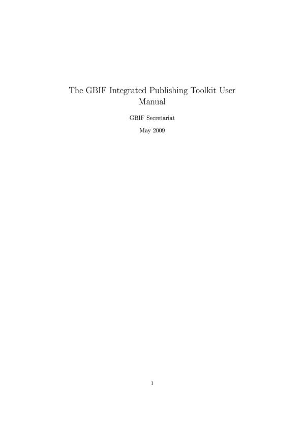 The GBIF Integrated Publishing Toolkit User ManualThe GBIF Integrated Publishing Toolkit User Manual GBIF Secretariat May 2009 1Published by: Global Biodiversity Information Facility http://www.gbif.org/ Copyright notice: This user manual is released under a 'Creative Commons Attribution-Noncommercial- Share Alike 3.0 Unported License' http://creativecommons.org/licenses/by-nc-sa/3.0/ In general terms, that means that you are free to copy, distribute, transmit, remix and adapt the work, under the following conditions: ⢠you must attribute the work in the manner speci�ed in this page (but not in a way that suggests that GBIF or the GBIF Secretariat endorses you or your use of the work); ⢠you may not use this work for commercial purposes; ⢠if you alter, transform, or build upon this work, you may distribute the resulting work only under the same or similar license to this one. Recommended citation: Réveillon, A. 2009. The GBIF Integrated Publishing Toolkit User Manual, version 1.0. Copenhagen: Global