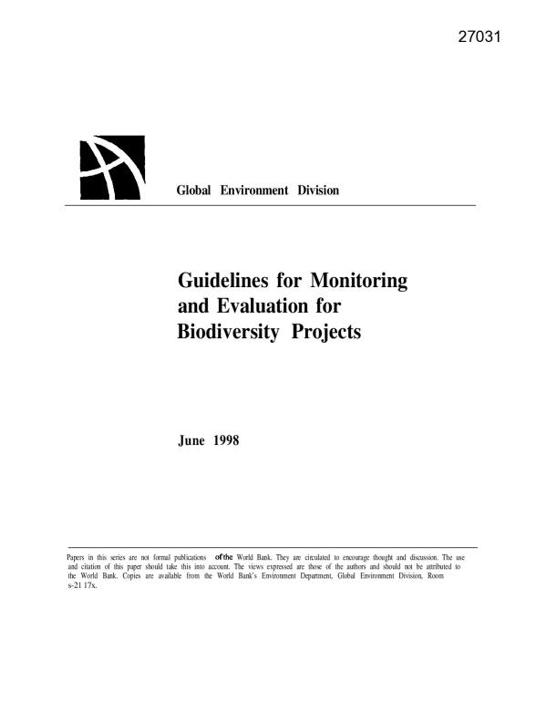 Biodiversity projects are designed on the assumption that project interventions will lead to conservation of key biological resources. Monitoring and evaluation are the primary mechanisms to assess whether a project is meeting its targets and objectives. These guidelines are intended primarily to assist World Bank task teams and consultants in the design and implementation of monitoring and evaluation (M&E) plans for biodiversity conservation projects or projects with biodiversity components. It is hoped that they may also serve as useful reference materials for government agencies, non-governmental organizations and others involved in the design, implementation or evaluation of biodiversity projects. M&E plans are mandatory for all Bank projects. They must be developed as integral elements of projects to provide information on whether project interventions are successful in achieving project objectives and on how social, economic, political and institutional factors are affecting project performance. Monitoring and evaluation for biodiversity projects involves two kinds of indicators: implementation performance indicators (project inputs and outputs) and project impact indicators (project impact on biodiversity). These guidelines focus primarily on the latter (impact indicators).