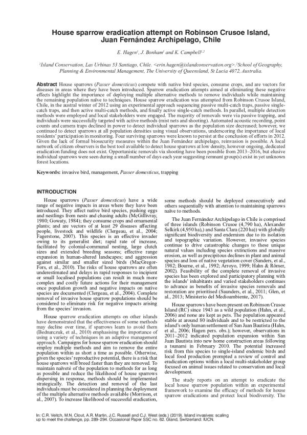 House sparrows (Passer domesticus) compete with native bird species, consume crops, and are vectors for diseases in areas where they have been introduced. Sparrow eradication attempts aimed at eliminating these negative effects highlight the importance of deploying multiple alternative methods to remove individuals while maintaining the remaining population naïve to techniques. House sparrow eradication was attempted from Robinson Crusoe Island, Chile, in the austral winter of 2012 using an experimental approach sequencing passive multi-catch traps, passive single-catch traps, and then active multi-catch methods, and finally active single-catch methods. In parallel, multiple detection methods were employed and local stakeholders were engaged. The majority of removals were via passive trapping, and individuals were successfully targeted with active methods (mist nets and shooting). Automated acoustic recording, point counts and camera traps declined in power to detect individual sparrows as the population size decreased; however, we continued to detect sparrows at all population densities using visual observations, underscoring the importance of local residents participation in monitoring. Four surviving sparrows were known to persist at the conclusion of eff orts in 2012. Given the lack of formal biosecurity measures within the Juan Fernández archipelago, reinvasion is possible. A local network of citizen observers is the best tool available to detect house sparrows at low density, however ongoing, dedicated eradication funding does not exist. Opportunistic removals via shooting have been possible from 20132016, but elusive individual sparrows were seen during a small number of days each year suggesting remnant group(s) exist in yet unknown forest locations.