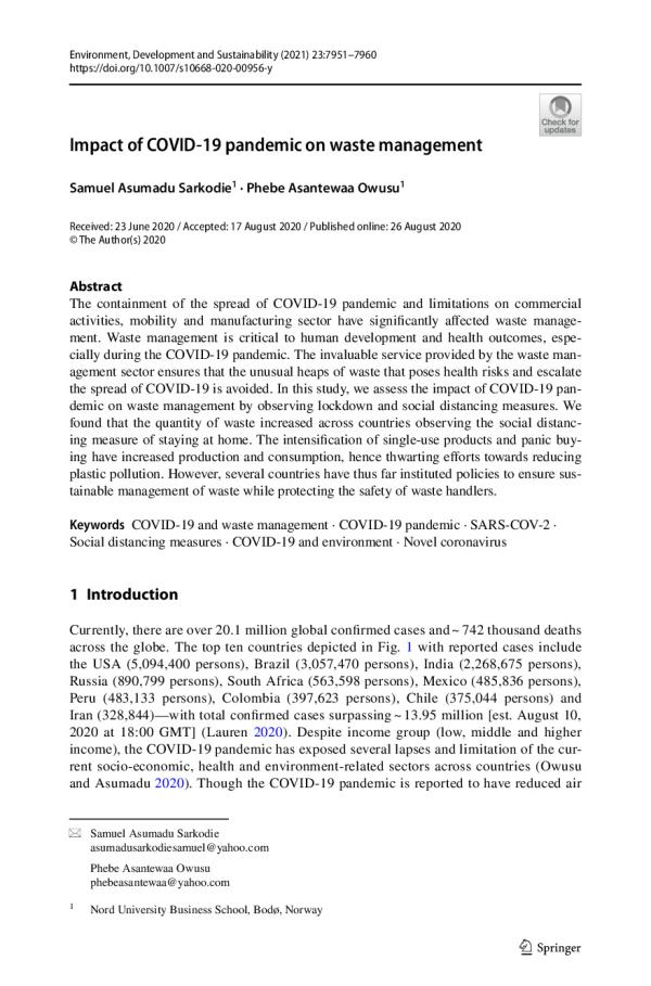 The containment of the spread of covid 19 pandemic and limitations on commercial activities, mobility and manufacturing sector have significantly affected waste management, Waste management is critical to human development and health outcomes, especially during the covid 19 pandemic. The invaluable service provided by the waste management, sector ensures that the unusual heaps of waste that poses health risks and escalate the spread of covid 19 is avoided. in this study, we assess the impact of COVID-19 pandemic on waste management by observing lockdown and social distancing measures.