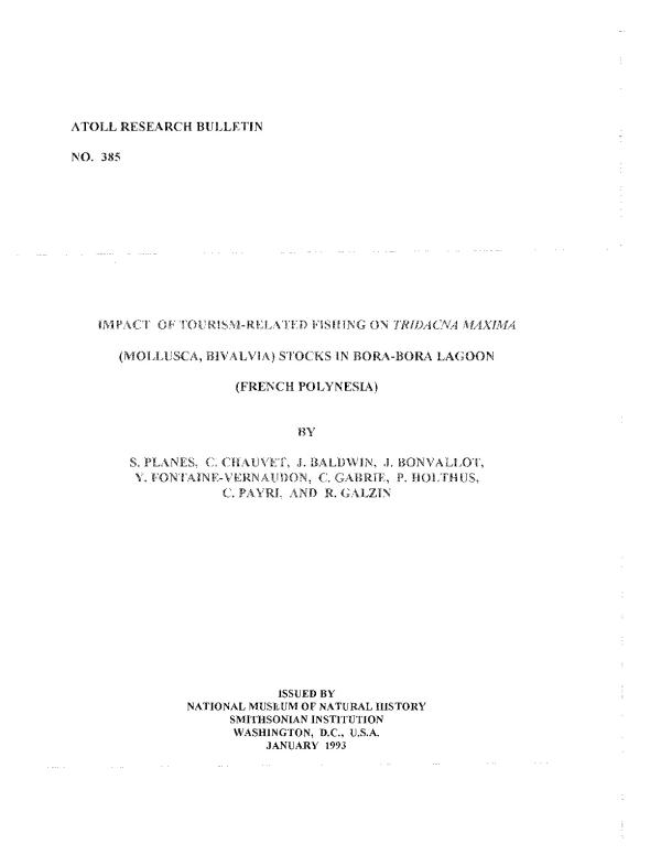 A survey of small giant clams ('Tridacna maxima), which are subject to human predation, was carried out on the resort island of Bora-Bora in French Polynesia. This paper emphasize the impact of tourism and local activities on the Tridacna populations. Daily tours to the lagoon include the tasting of small giant clams. A study of clam abundance shows that the overall reef stock is still large. However a comparative analysis of the population structure of this clam, in four locations, shows a significant decrease in the average shell size of the living populations and a reduction in the average size of shells consummed by tourists. The average size of clams consummed by tourists fell from 130 mm to 108 mm in less than one year. On the fringing reef, the environmental conditions have reduced recruitment and increased natural mortality. This natural loss of giant clams along with the increasing human predation is decimating the standing stock of this area.