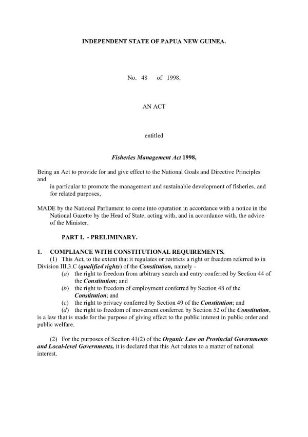 Being an Act to provide for and give to the National Goals and Directive Principles and in particular to promote the management and sustainable development of fisheries, and for related purposes, MADE by the National Parliament to come into operation in accordance with a notice in the National Gazette by the Head of State, acting with, and in accordance with, the advice of the Minister.